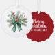 A festive pairing of holiday illustrations: Front featurers pine branches, eucalyptus leaves, red berries, and a green ribbon bow; the back showcasing elegant white script on rich red, celebrating family and seasonal warmth with the message “Merry Christmas" and the senders name.
