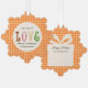 A modern and neatly designed Christmas Personalized Ornament Card with the word LOVE in adorable serif typography style and bright orange color palette, customizable and perfect for Christmas Tree decoration and sending the warmest wishes to your loved ones in the jolly season.