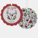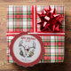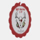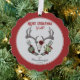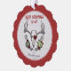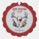 Esta tarjeta ornamenta de papel de los Navidades del país occidental "Feliz Navidad y Todos" incluye ilustraciones occidentales a mano de un cráneo de reno adornado con rosas rojas y cactus festivos con tinta negra. La parte posterior presenta un bonito patrón con cráneos de renos, puntias, cactus y rosas rojas. Nombre familiar personalizado. Elegante frontera gris suave y rojo festivo.