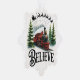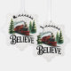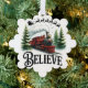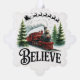 Un ilustracion de Navidades festivos con un tren rojo vintage que recorre pinos nevados. Arriba, el trineo y reno de Santa se elevan por el cielo nocturno, mientras que la palabra "CREER" nos recuerda que debemos mantener viva la magia de los Navidades.