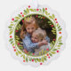 A contemporary classic Christmas card adorned with orange and pink-red berries, complemented by wreath leaves in shades of light and dark green. It offers space to personalize the text, family name, and year, as well as the option to add a chosen personal photo on the front. The backside of the card is designed for a customizable seasonal greeting message.