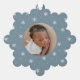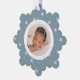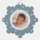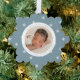Celebra la primera Navidad de tu bebé con amigos y familia con nuestra elegante tarjeta de ornamento navideño azul hielo y blanco. La parte delantera de la tarjeta muestra la foto de su bebé rodeada por un marco blanco con un fondo con estampado azul y blanco de copo de nieve en invierno. Personalice la parte delantera de la tarjeta de ornamento de copo de nieve con el nombre y las estadísticas de nacimiento de su bebé con letras azul claro. La tarjeta de ornamento del anuncio de nacimiento de los Navidades se revierte para mostrar una foto adicional.