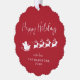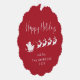 Divertida tarjeta de Navidades rojos y blancos de temporada que también puede servir como adorno de árbol de papel y etiqueta de regalo con una silueta de renos que vuelan el trineo de Santa por el aire y "Felices Fiestas" en un elegante guión moderno y tu nombre u otro texto debajo. Añadir una foto al fondo.