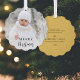 Tarjeta de saludo de vacaciones moderna que también se puede usar como etiqueta de regalo y adorno de árbol de papel. La parte delantera muestra tu foto con "Feliz Navidad" en una tipografía y escritura elegantes. Al fondo, personaliza tu saludo, nombres y el año en una tipografía simple sobre un fondo dorado.