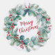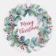 A beautifully illustrated Christmas wreath featuring lush eucalyptus, pine sprigs, and vibrant red berries. The elegant red script “Merry Christmas” adds warmth and seasonal charm, perfect for evoking holiday cheer and timeless celebration.