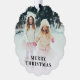 Tarjeta de saludo de vacaciones moderna que también se puede usar como etiqueta de regalo y adorno de árbol de papel. La parte delantera muestra tu foto rebosada con "Feliz Navidad" en una tipografía elegante. Al fondo, personaliza tu saludo, nombres y año en una tipografía simple sobre un fondo verde sabio oscuro.