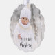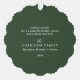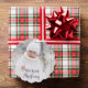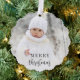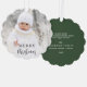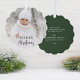 Tarjeta de saludo de vacaciones moderna que también se puede usar como etiqueta de regalo y adorno de árbol de papel. La parte delantera muestra tu foto con "Feliz Navidad" en una tipografía y escritura elegantes. Al fondo, personaliza tu saludo, nombres y el año en una tipografía blanca simple sobre un fondo verde.