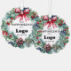 Custom "Happy Holidays" budget paper ornaments for clients, personalized with your business logo, the year, a big festive floral wreath, and an elegant red bow. Company promotional supplies for the Holidays, you can order in bulk for your employees or as branding and marketing supplies to promote your store to customers.