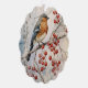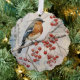 A winter Robin on a branch with red berries, Christmas ornament, with a red text on the back