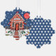Un ilustracion colorido de una casa de jengibre festiva. El exterior de la casa está decorado con dos latas de caramelo y tiene un gran árbol de langosta en el jardín. El suelo está cubierto de una brillante nieve de azúcar blanca de hielo y repleto de dulces.