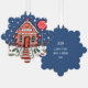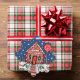 Un ilustracion colorido de una casa de jengibre festiva. El exterior de la casa está decorado con dos latas de caramelo y tiene un gran árbol de langosta en el jardín. El suelo está cubierto de una brillante nieve de azúcar blanca de hielo y repleto de dulces.