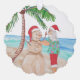 Una hermosa acuarela pintada a mano Navidades de pájaro de nieve adorno humorístico. Santa adorna una palmera adornada con adornos en la playa.