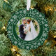 Moderna nuestra primera tarjeta de adorno de festividad de la pareja de Navidad - fondo verde del bosque con copos de nieve. Esta es una tarjeta de felicitación que también es un adorno.
