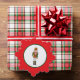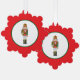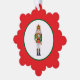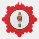 Red snowflake ornament with scalloped edges featuring a traditional nutcracker in red, green and gold, hanging on a christmas tree with warm lights