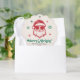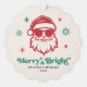 Tarjeta de adorno navideño con un Santa Claus genial que lleva gafas de sol y el texto "Merry & Bright" en una divertida fuente retro. Gafas rojas y verdes sobre un fondo crema claro. Los colores se pueden personalizar en la herramienta de diseño.