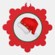 Festive red snowflake ornament with santa hat and gold stars, hanging on a green christmas tree with warm lights