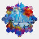 SlipperyJoe NYC luna de graffiti rodeada de nubes dramáticas giratorias cielo intensos degradados de color vívido paisaje urbano realismo fantasía rascacielos edificios mashup grit urbano artístico de ensueño similar orgullo gay regalos LGBTQIA blues fiery rods púrpura amarillos soñar casi como narración de ciencia ficción tonos fríos energía