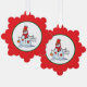 red scalloped ornament featuring a snowman with red hearts, holding an orange bauble and snowy branch, hanging on a festive christmas tree