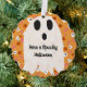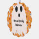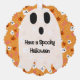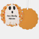 A cute hand drawn illustration of festive blend of ghosts and pumpkins on a vibrant orange background, evoking a playful Halloween spirit.