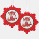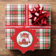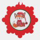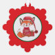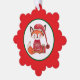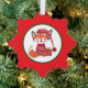 A festive ornament featuring a cartoon fox in holiday attire, seated beside a wrapped gift. Set within a red scalloped-edge frame, this design adds a playful yet classic touch to seasonal décor and gift collections.