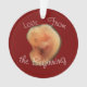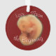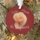 Recién nacido (feto) adorno con imagen del feto sobre fondo rojo.