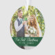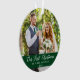 Elegante caligrafía Escribir nuestro primer adorno verde de foto navideña con copos de nieve de vuelta - Perfecto para una foto Boda o una foto de pareja