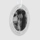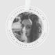 Elegante adorno de árbol de navidad funerario de moda para celebrar la memoria de tu ser querido en un moderno diseño minimalista sobre un simple fondo blanco y limpio. El diseño puede ser fácilmente personalizado con su propia foto y texto para crear un tributo especial para el funeral, el memorial o la celebración de la vida de su ser querido. La imagen que se muestra es para fines de ilustracion y sólo se sustituye por la suya. La imagen de marcador de posición es de una mujer hermosa con el pelo rizado oscuro usando una bufanda y es disparada en blanco y negro monocromo.