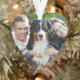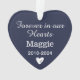 Sencillamente elegante adorno conmemorativo en forma de corazón puede ser personalizado como un recuerdo especial de la pérdida de un perro mascota, un gato u otro ser querido. Design incluye una foto en la parte delantera y el personalizado "Para siempre en nuestros corazones" con su nombre y su esperanza de vida en la parte trasera. Se pueden modificar los estilos de color y fuente azul de media noche.
