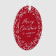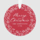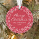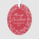 Elegante ornamento de fotos de vacaciones con "Feliz Navidad" exhibido en un guión de caligrafía blanca rodeado por una corona de copos de nieve y ramas de pino sobre un fondo rojo. Personalice la parte delantera del adorno añadiendo su apellido y el año. En la parte posterior del adorno se muestra la foto de tu familia favorita, lo que hace que sea el placer perfecto para regalar a amigos y familiares.