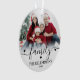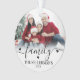 Ornamento fotográfico de Navidades familiares. Celebra la alegría de la temporada con este elegante adorno personalizado con tus fotos favoritas. La parte frontal muestra la palabra "familia" en el guión que fluye por la parte superior, con el nombre de su familia debajo en una letra serif intemporal para un toque personal. La parte trasera incluye espacio para una segunda foto, perfecta para otro recuerdo favorito o momento festivo. Detalles suaves y oscuros en blanco y tonos personalizable y colores de acento hacen de este adorno conservador un aditivo cálido y clásico a su decoración de vacaciones.