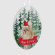 Cuta adorno de Navidad de perro pomerano colocado en un fondo de pino y abeto con el mensaje de la fiesta "Felices cumpleaños" . Visite nuestra tienda para ver una gran variedad de panes de perro