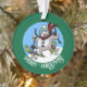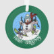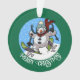Una decoración festiva para tu árbol de Navidad, con un personalizado de un muñeco de nieve alegre con la nariz de zanahoria y ojos de carbón, salpicando por la nieve en los esquíes, en un gorra de invierno lúgubre y bufanda de tartán. Una imagen optimista para Navidad o durante el invierno. Cambie el texto predeterminado de "¡Feliz Navidad!" a su mensaje o leyenda preferido.