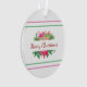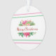 Este adorno festivo tiene un fondo blanco con recortes de color. En el centro, hay regalos envueltos rojos y verdes, con brotes de holly y de siempre verde. En la parte superior e inferior del adorno hay rayas de acento rosas y verdes. El texto de "Feliz Navidad" puede ser reemplazado por un nombre, una ocasión especial o incluso una fecha. La parte posterior del ornamento tiene una versión más grande del regalo y el motivo evergreen y usted puede añadir su propio mensaje.