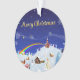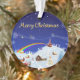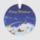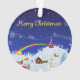 Hermoso paisaje de nieve con árboles de Navidad, casas, un hombre de nieve, una iglesia y un arcoiris con copos de nieve cayendo. Papá Noel y un reno caminando juntos para distribuir regalos de Navidad en la noche de los Navidades. Escenario de Navidades hermosos y únicos para las temporadas de vacaciones.