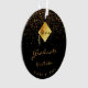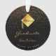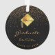 Para una celebración de graduación moderna y trendy. Un fondo negro elegante con confeti dorado. El texto: Graduate está escrito con un estilo de letra manuscrita grande, letras doradas. Plantilla para un nombre y año. Decorado con un tope de borla de gorra dorada falsa abstracta moderna. Para él y ella. Perfecto como regalo, recuerdo o decoración de fiesta.