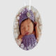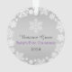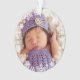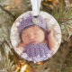 Elegant snowflake framed baby's first Christmas photo ornament design features a round border wreath of white winter snowflakes that frame the baby girl's newborn photo. A custom "Baby's First Christmas" message appears on the back with text the can be personalized with baby boy's name and birth year. The silvery gray and violet purple color scheme can be changed to match your photo!