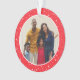 Fotografía simple y moderna diseño de adorno navideño con una imagen redonda enmarcada por un patrón de luces y estrellas brillantes. La parte posterior del adorno incluye "Merry and Bright" en un texto de escritura elegante con texto personalizado para el año. Se puede modificar el color de fondo rojo brillante festivo.