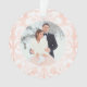 Personalice este elegante ornamento de vacaciones de recién casados con keepsake con su retrato favorito del día de la boda (consejo: recortar foto a forma cuadrada antes de subir). Un patrón de damasco vintage de lino rosa rubor enmarca la foto y proporciona un fondo decorativo al elegante personalizado "Merry and Married" en la parte posterior.