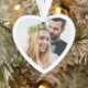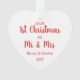Un adorno navideño lindo para conmemorar tu primera boda navideña. En la parte delantera, la imagen llena un marco con forma de corazón blanco. Al contrario, puede personalizar las expresiones "Navidades primero", "Sr. y Sra." y personalizar sus nombres y año, todo en una tipografía roja estacional contra un fondo blanco.