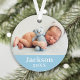 Simplemente elegante ornamento de fotos para la Primera Navidad del bebé puede ser personalizado con una foto recién nacida y texto personalizado para el nombre. Elija incluir la misma foto en ambos lados o dos fotos diferentes. El color de fondo azul puede cambiarse para que coincida con tus fotos.