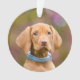 Un joven cachorro Vizsla de color rojizo se inclina curiosamente contra un tronco de árbol conocido. El húngaro o Magyar Vizsla es una raza de perro de caza. Una linda foto de perro tomada por Katho Menden. Este adorno de Navidad circular es una idea de regalo para los amantes del perro.