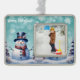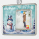 Decoren su árbol esta temporada de vacaciones con un Verde azulado ornamento de fotos de Navidades de Snowman en el bosque de invierno. El diseño de un adorno incluye un lindo muñeco de nieve con sombrero de punta en una bufanda parado en una escena del bosque invernal con caída de nieve. También hay artículos de regalo y de vacaciones disponibles con este diseño.
