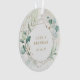 Un adorno acrílico moderno y elegante con nombres y fecha boda en el interior de un marco geométrico de oro falso rodeado de hojas de eucalipto verde y vegetación con un toque de azul, sobre un lavado de color pastel con especkles de purpurina de oro falso. La parte trasera tiene tu foto boda favorita. Este adorno rústico botánico también hace un gran regalo para una pareja recién casada por su primera Navidad.