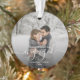 Conmemore su compromiso con este hermoso adorno de conservas moderno. El texto blanco dice "Nuestra primera Navidad comprometida", con la palabra "comprometida" en un elegante guión de escritura a mano con flores antes y después. Reemplace la imagen de ejemplo con su foto favorita y agregue sus nombres y el año. Un filtro de degradado oscuro ayuda a hacer que el texto aparezca.