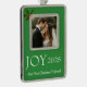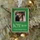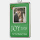 Framed photo ornament is shown in silver tone metal with a green color background and a sample photo, customize this ornament and just change the photo to your own great photo and change the text if you wish with this template.