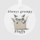 Un lindo gatito gruñón con las divertidas y sarcásticas "fiestas felices" con este año, nombre y en la espalda "siempre gruñón". Un ilustracion de acuarela de este gato enfurecido escondido en una caja vacía.
