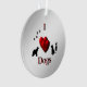 Un diseño único del corazón I con un corazón 3d. Está decorada con perros y huellas de cachorros a ambos lados del corazón haciendo un diseño divertido para la decoración de los árboles de Navidad.