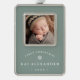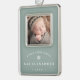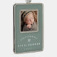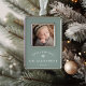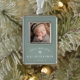 Un hermoso diseño clásico para conmemorar la primera Navidad del bebé, con una foto favorita en un panel de entrada. Personalice el nombre del bebé con letras clásicas del serif, junto con el año, en un suave fondo verde eucalipto con un solo acento de copo de nieve.