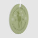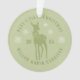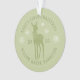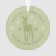 Moderno ornamento verde polvoriento para la primera Navidad del bebé personalizado con el nombre del bebé, año, ciervo con un arco, copos de nieve y letras curvadas en letra de serif.