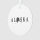 Esta palabra arte afirma que el adorno navideño de Alaska incluye el nombre "Alaska" en negrita en mayúsculas negras con la letra "A" reemplazada por la forma de mapa de silueta de contorno del estado de la última frontera de Alaska rellenado con un fondo negro sólido para coincidir con las otras letras negrita del tipo de letra del texto.